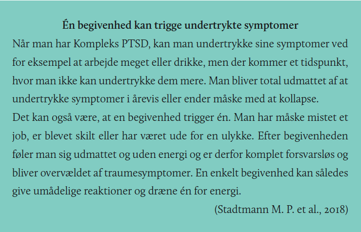 Virkeligheden ville have mig et andet sted hen. Jeg forstod ikke, hvad der skete med mig, da jeg stod uden job og havde fået en masse uforståelige symptomer. Naivt konkluderede jeg, at jeg bare havde fået stress, og at jeg snart ville vende tilbage til mit gamle jeg. Men hvordan kunne jeg det, når mine evner og min hverdag var vendt på hovedet, og jeg samtidig var bange for, at jeg eller mine børn pludselig ville dø? Det kunne jeg heller ikke. Jeg havde fået Kompleks PTSD.
