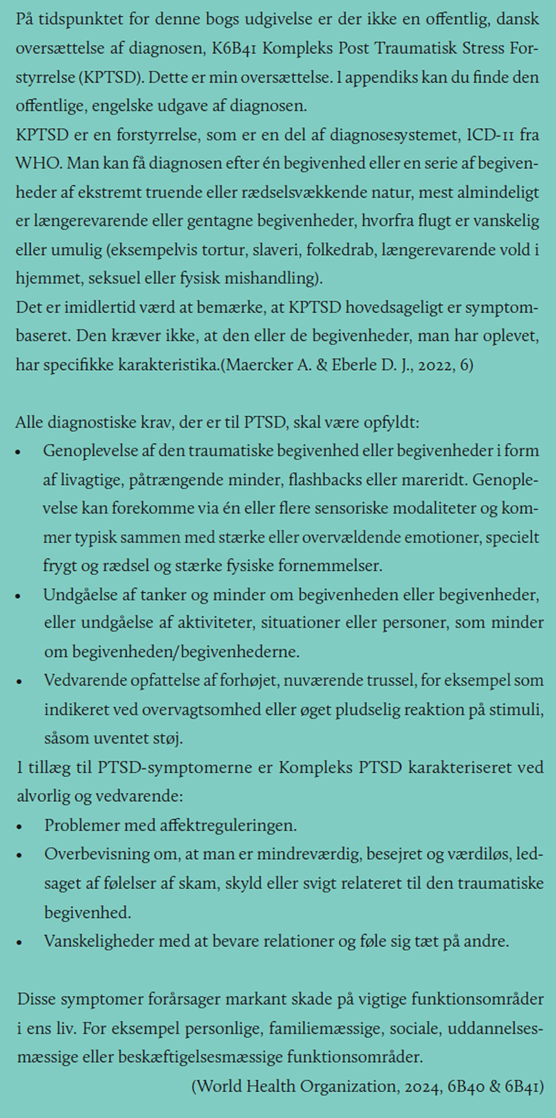 Han rystede på hovedet. “Det vil jeg ikke sige, for jeg mener, at din personlighed var forstyrret inden da. Din psykolog bruger også et andet diagnosesystem, end jeg gør. Jeg bruger ICD-10.” Han holdt en pause. “Det er i bund og grund det samme, vi mener. Du kan godt sige, at det er Kompleks PTSD, du har. Der er ingen grund til, at du ændrer din opfattelse.